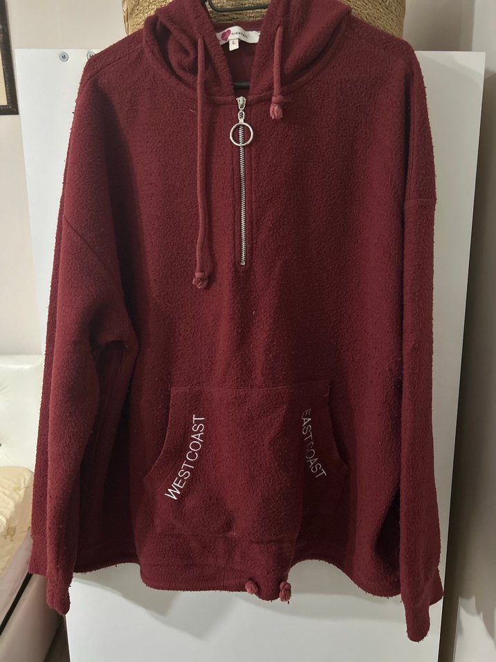 Bordo renkli, kapüşonlu ve fermuarlı sweatshirt. Uzun kollu, bol kesim. Kanguru cebinde yazı detayları bulunur. Kumaşında biraz topaklanma mevcuttur.