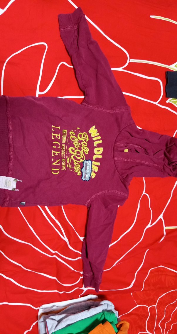 Bordo uzun kollu, kapüşonlu ve fermuarlı erkek sweatshirt. Renkli baskılı, dar kesim ve yumuşak, sıcak tutan kumaştan yapılmıştır.