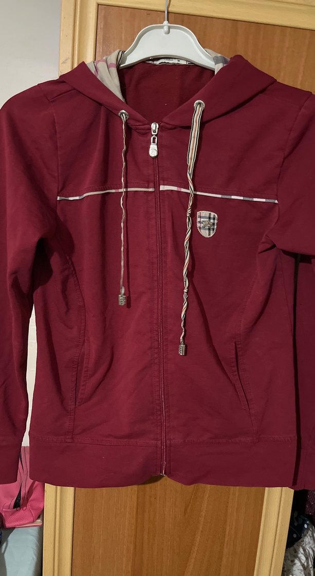 Bordo renkli, kapüşonlu ve fermuarlı bu kadın ceketi, uzun kollu ve parlak görünümlüdür. Yumuşak ve sıcak kumaştan üretilmiştir, günlük kullanım için uygundur.