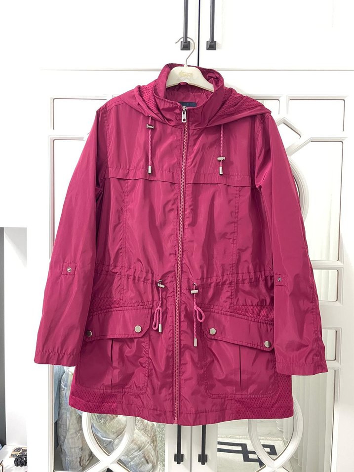 Bordo renkli, fermuarlı ve kapüşonlu kadın ceketi, bol kesim ve çıtçıtlı kollarıyla dikkat çeker. Sentetik kumaştan, günlük kullanım için uygundur. Hiçbir defosu yoktur. 42 beden fakat 38-40a uyum sağlar.