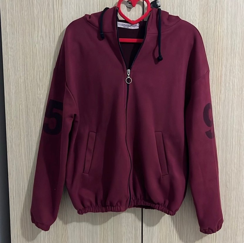 Bordo kapüşonlu fermuarlı sweatshirt, uzun kollu ve kollarında baskılı desenlidir. Bol kesim ve kısa boyda, yumuşak ve sıcak kumaştan yapılmıştır.