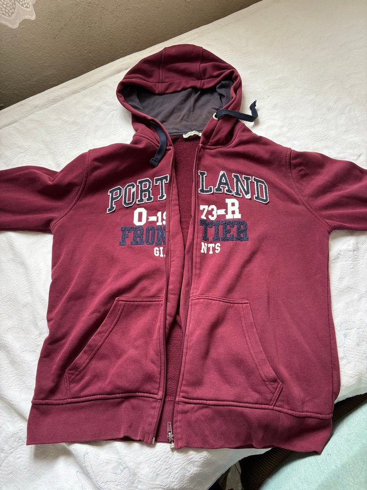 Bordo renkli, kapüşonlu ve fermuarlı sweatshirt. Yumuşak ve sıcak kumaştan, bol kesim, baskılı detaylar ve ön cepler bulunur. Günlük rahat stil için uygun. ✨