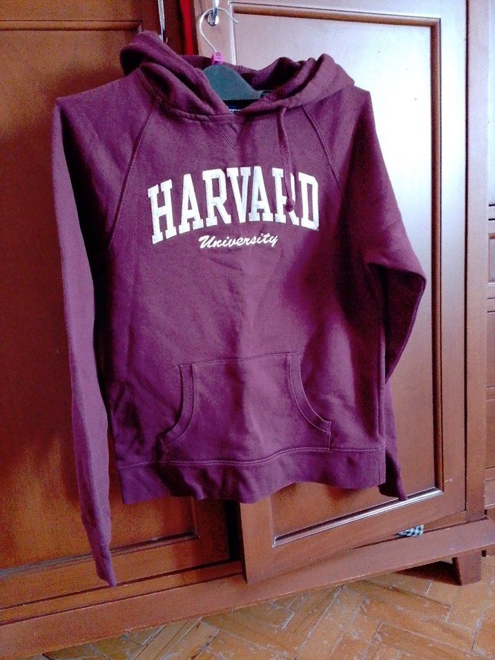 Bordo renkli, kapüşonlu ve uzun kollu örme kumaştan, Harvard Üniversitesi baskılı bol kesim kadın sweatshirtü.
