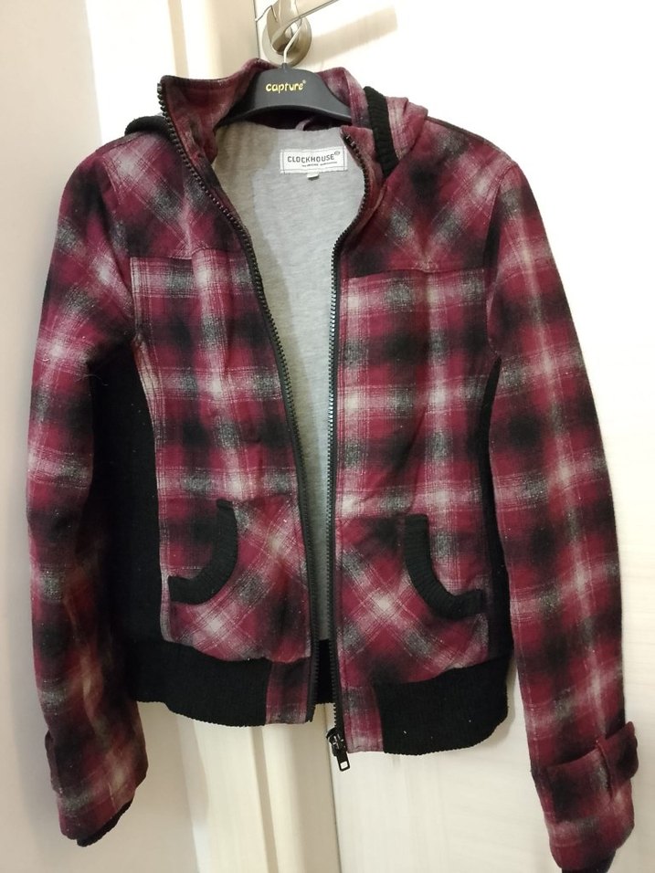 Uzun kollu, kapüşonlu ve düğmeli, bordo ekose desenli kadın ceketi. Yumuşak ve sıcak kumaştan, rahat sokak stili için uygun.