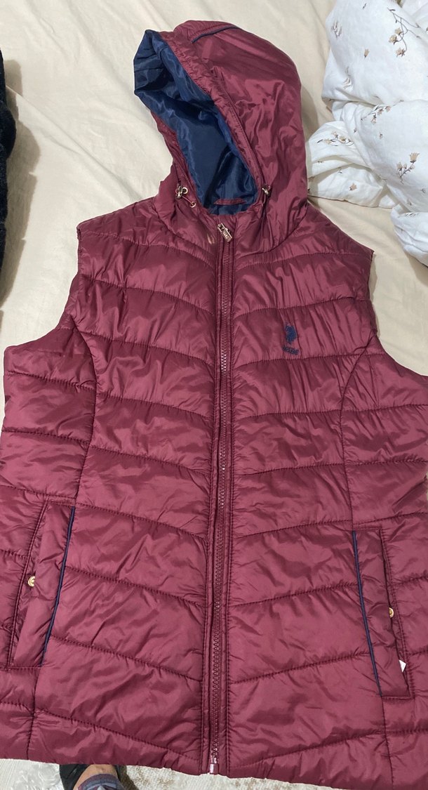 Bordo parlak şişme yelek, kapüşonlu ve fermuarlı. İnce kesimi ve normal boyuyla günlük şıklığa uygundur.