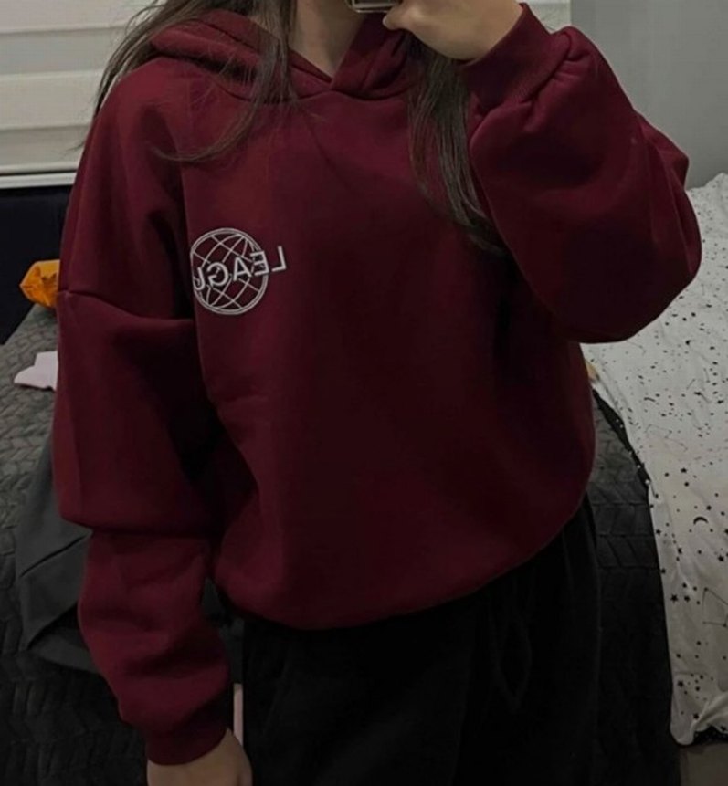 Bordo renkli, uzun kollu, bol kesim kadın sweatshirt. Örme dokusu ve baskılı deseniyle rahat ve yumuşak kumaş içerir. Günlük kullanım için uygundur. Bir defa kullandım.