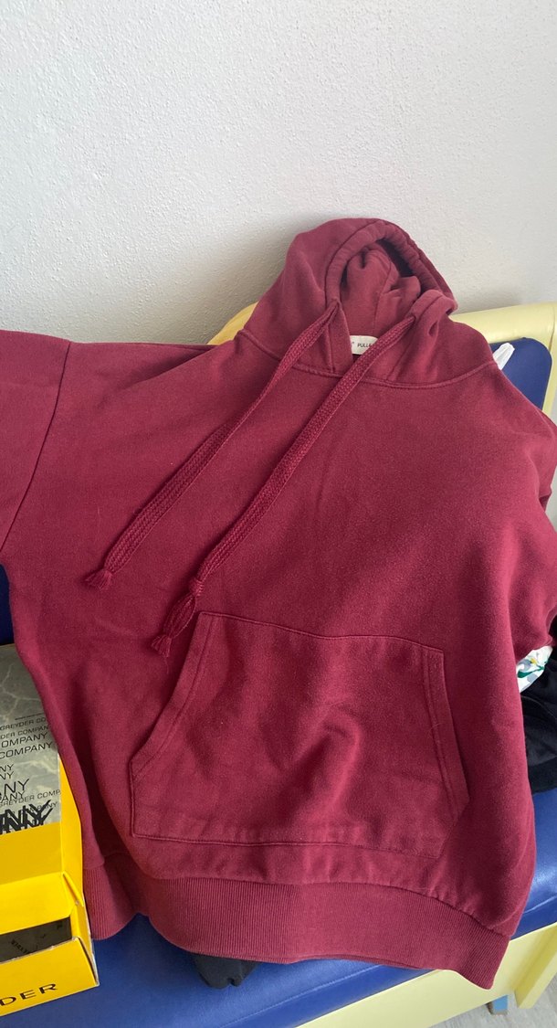 Yumuşak ve sıcak kumaştan, bol kesim bordo kapüşonlu sweatshirt, uzun kollu ve fermuarlı ön cep detaylı. Günlük kullanım için uygun.
