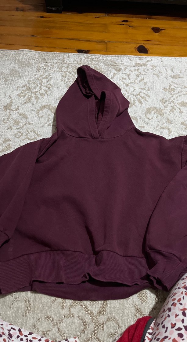 Bordo kapüşonlu sweatshirt, uzun kollu ve bol kesimdir. Yumuşak fleece kumaştan, kürk detaylı rahat ve günlük kullanıma uygun.