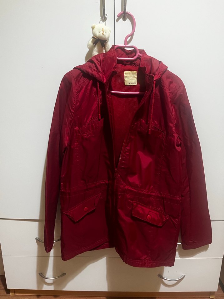 Bordo renkli, parlak ve ipeksi kumaştan, kapüşonlu, uzun kollu, fermuarlı kadın yağmurluğu. Salaş kesimi ve midi boyuyla günlük sokak stiline uygun.