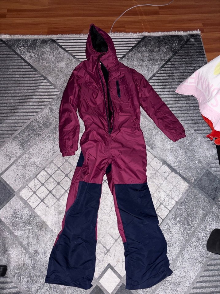 14 yaş sadece bir gün kayakta giydi Bordo renkli, kapüşonlu kız çocuk kayak tulumu, fermuarlı ve yakası çentikli modeldir. Lacivert detaylı ve desen içermeyen kumaştan üretilmiştir. ❄️