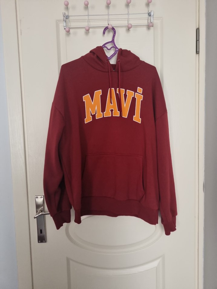 Bordo renkli, kapüşonlu ve uzun kollu sweatshirt, bol kesim ve yumuşak örgü kumaştan üretilmiştir. Önünde "MAVI" baskısı ve kanguru cebı bulunur. orjinaldir