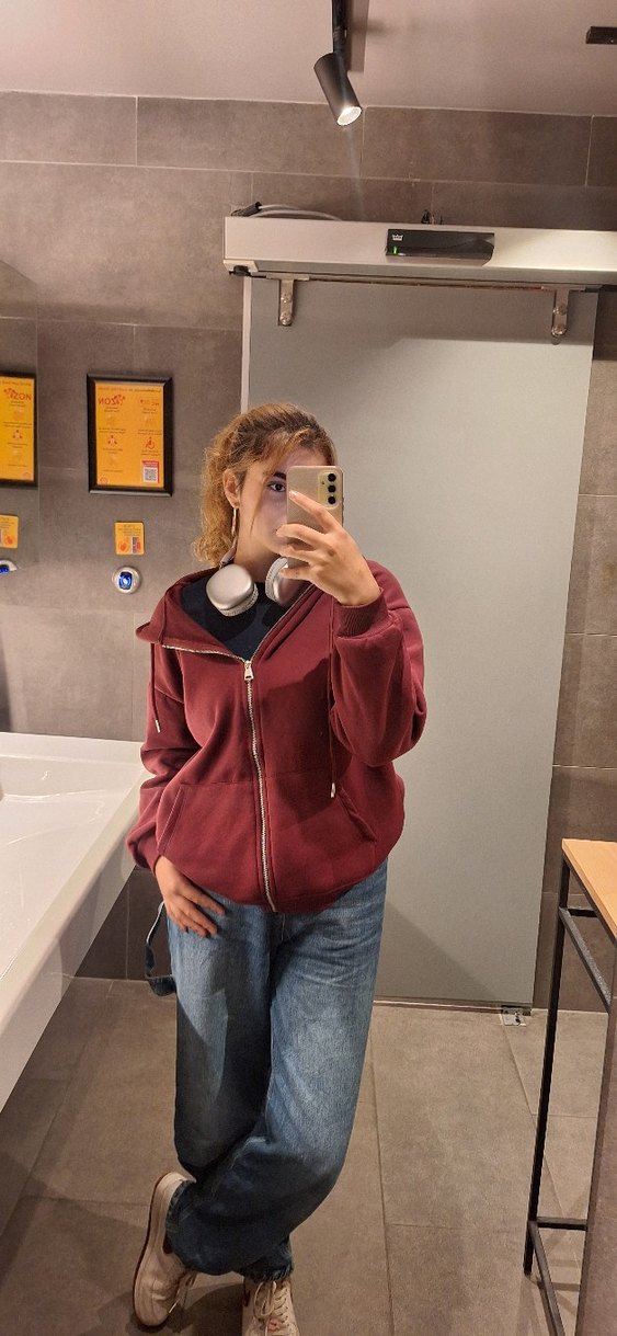 Bordo renkte, yüksek yakalı ve uzun kollu, bol kesim normal midi boy kadın ceket. Yumuşak ve parlak kumaştan, rahat ve şık bir sokak stili sunar.