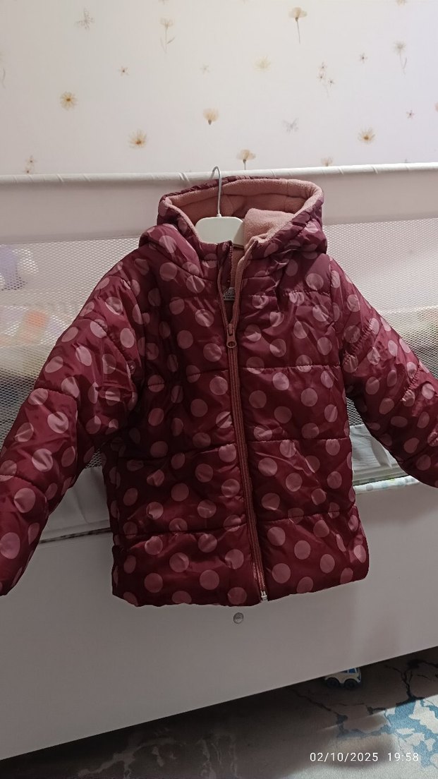 Bordo renkli, kapüşonlu ve düğmeli, puantiyeli desenli, dar kesim kız montu. Trend sokak stili için ideal. yeniden farksız çizik dahi yok