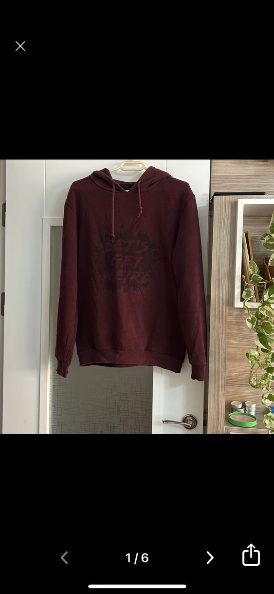 Bordo renkli, kapüşonlu ve uzun kollu sweatshirt, rahat kesimli ve baskılı desene sahiptir. Yumuşak ve sıcak kumaştan, günlük sokak stili için uygundur.