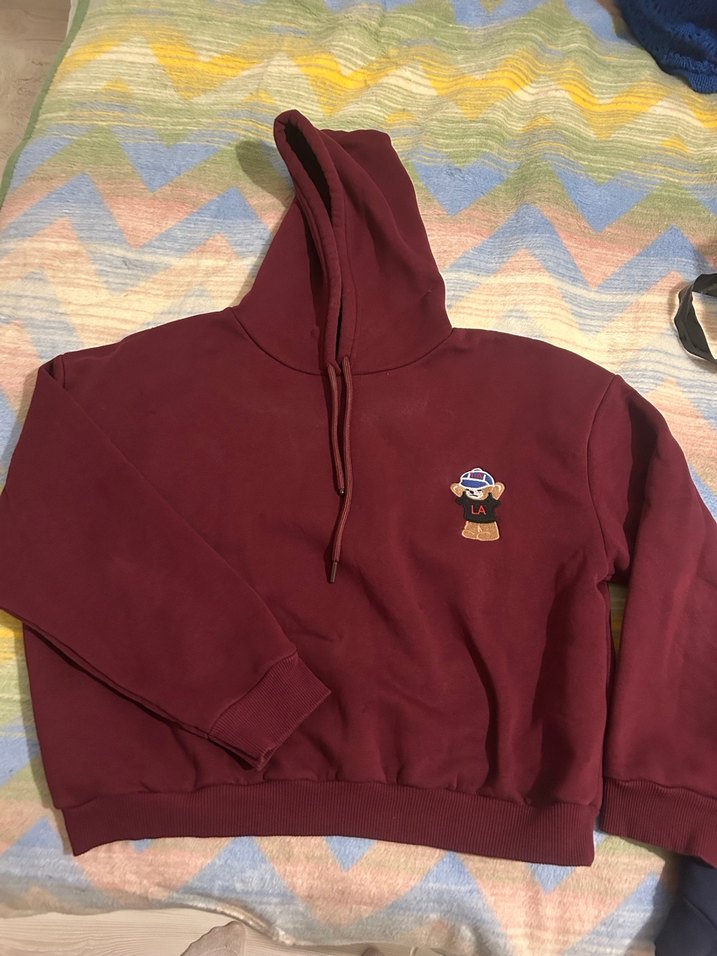 Bordo kapüşonlu sweatshirte uzun kollu ve bol kesim vardır. Yumuşak ve sıcak kumaştan üretilmiştir. Göğsünde baskılı detay bulunur. Hiçbir sıkıntısı yok sayılı kullandım