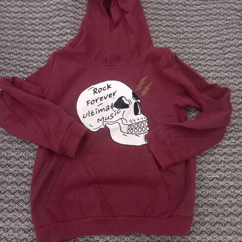 Bordo renkli, uzun kollu ve rahat kesim çocuk sweatshirtü. Yuvarlak yaka, örgü yapıda yumuşak ve sıcak kumaş. Üzerinde rock temalı baskılı kafatası deseni bulunur.