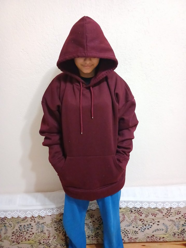 Bu kadın ve erkek giyim sweatshirtü, bordo renginde kapüşonlu ve uzun kollu içi polarlı yumuşacık salaş kesime sahiptir . günlük kullanıma uygun rahat ve şık bir görünüme sahiptir. Desensiz tasarımıyla zahmetsiz şıklık sunar. 2 omuz aralığı 70 santim boy uzunluğu 65 santim sweatshirtün kol uzunluğu 53 santimdir