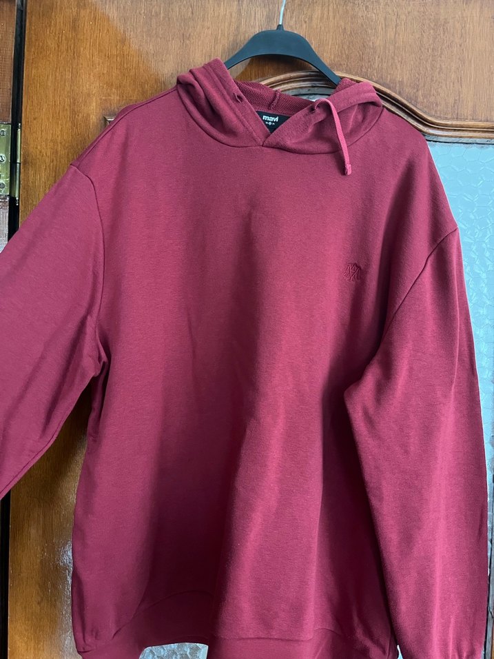 Bordo renkli, kapüşonlu sweatshirtü, bol kesim ve uzun kolludur. Yumuşak ve sıcak kumaştan üretilmiş, günlük rahat kullanıma uygundur.