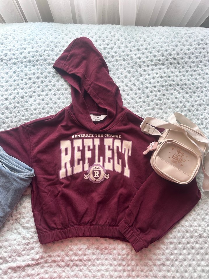 Bordo renk, kapüşonlu, uzun kollu, bol kesim kadın sweatshirt. Parlak örgü kumaş ve önünde "REFLECT" baskısı bulunur. Rahat sokak stili için uygundur.