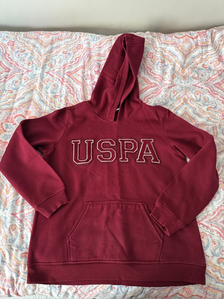 Bordo renkli, USPA yazılı sweatshirt, yuvarlak yaka ve uzun kolludur. Yumuşak kumaştan, bol kesim ve fermuarlı detaylıdır.