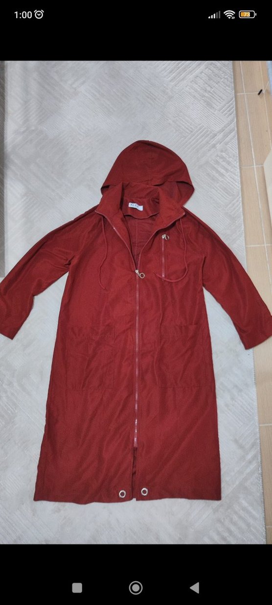 Bordo renkli, kapüşonlu ve fermuarlı uzun yağmurluktur. Bol kesim olup, yumuşak ve sıcak kumaştan üretilmiştir, günlük kullanıma uygundur. ️