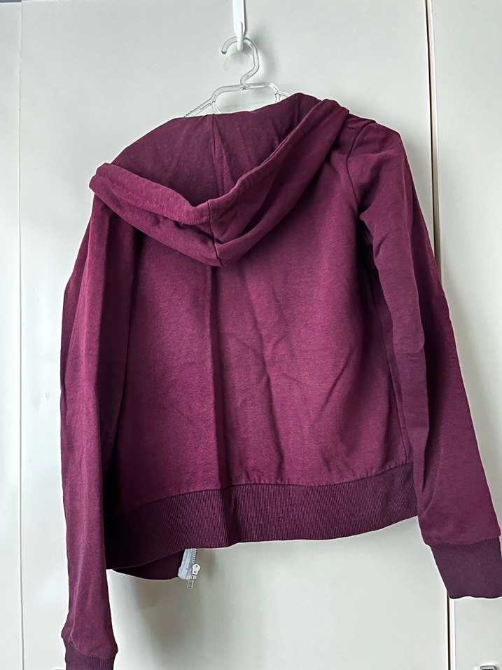 Bordo renkte, uzun kollu ve kapüşonlu, fermuarlı sweatshirt. Rahat kesim ve normal boyda, yumuşak ve sıcak kumaştan üretilmiştir.