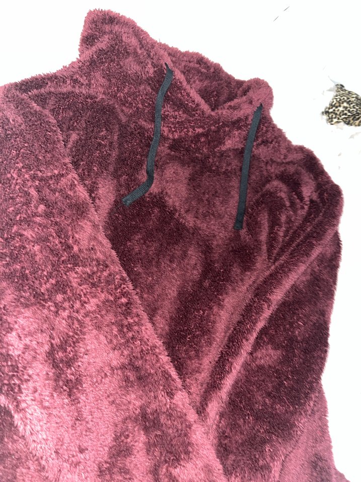 Bordo renkli, yumuşak peluş kumaştan, kapüşonlu ve uzun kollu, bol kesim sweatshirt. Rahat ve günlük kullanım için uygundur.
