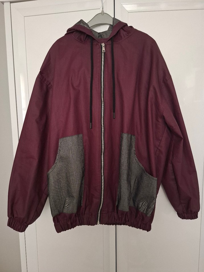 Bu kadın ceketi, kapüşon ve fermuar detayına sahip olup bordo ve gri renklerin birleşimiyle bol kesim sunar. günlük rahat kullanıma uygundur, uzun kollu ve midi boydadır. üzeründe xl yazıyor ama 44-46 bedene uygundur Overize model iki koltuk arası 65 cm boyu 64 cm