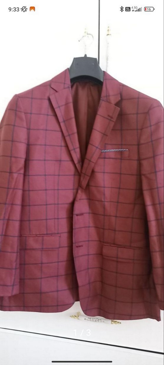 Bordo renkli, kare desenli erkek ceket. Notlu yaka, düğmeli ve uzun kolludur. Ofis ve sokak tarzına uygundur.1 veya 2 defa giydim. çok az kullanılmıştir. 170 boy 70 kg giydim. kilo boy olarak 5 aşağısı veya 5 yukarısı olanlara rahat olur diye düşünüyorum