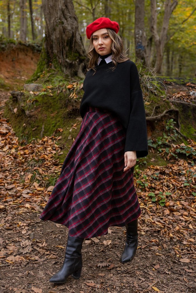 Bordo Kare Desenli Uzun Etek