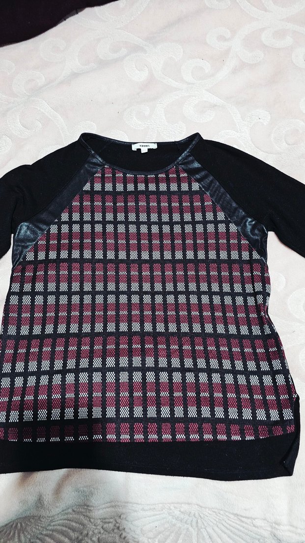 Bordo ve siyah kare desenli, uzun kollu, yuvarlak yakalı, bol kesim ve normal boyda triko bluz. Günlük rahat sokak stili için uygundur.