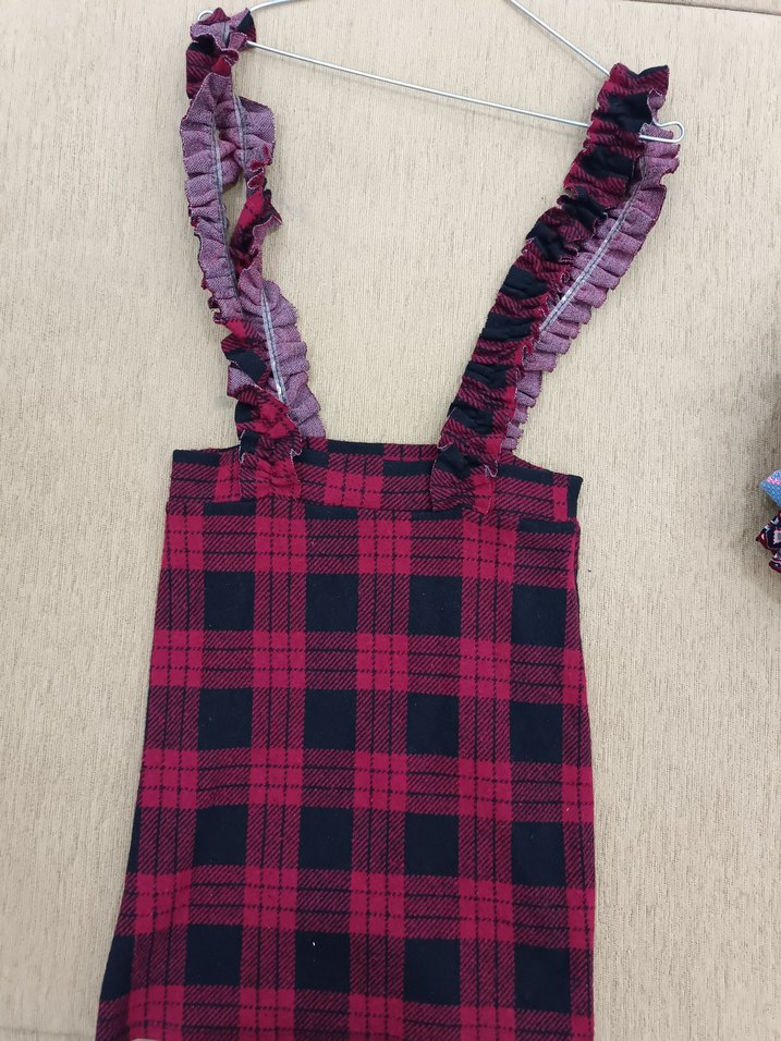 Koyu bordo kareli desenli, fırfırlı askıları olan