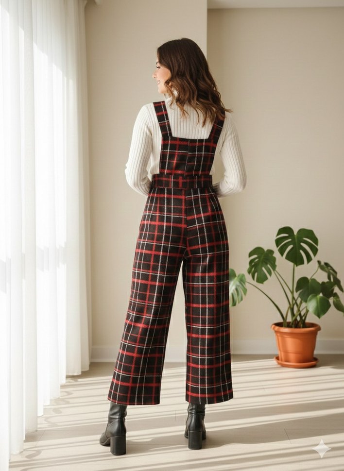 Bordo kareli tulum, askılı kol ve boğazlı yakaya sahip, tokalı detaylı ve rahat sentetik kumaştan üretilmiştir. Normal kesim ve midi boydadır, günlük sokak stiline uygundur.