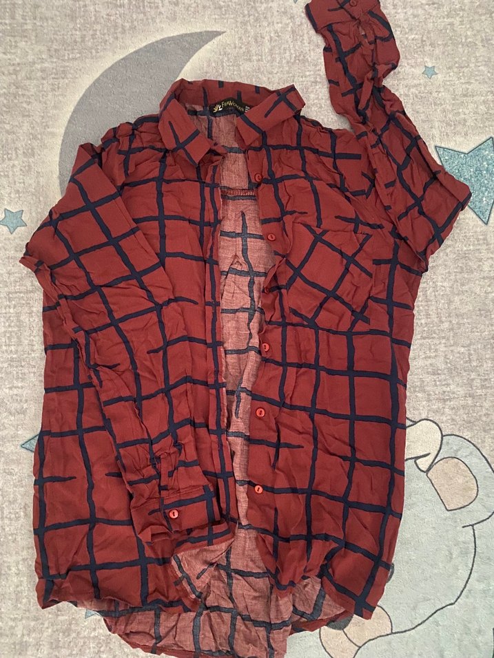 Bordo renkli, kareli desenli kadın gömlek. Düğmeli ve uzun kollu, salaş kesim ve midi boyda. Yumuşak dokulu kumaştan, günlük kullanıma uygun. Bir kere belki giymişimdir sadece kırışık. Haricinde bir sorunu yok.