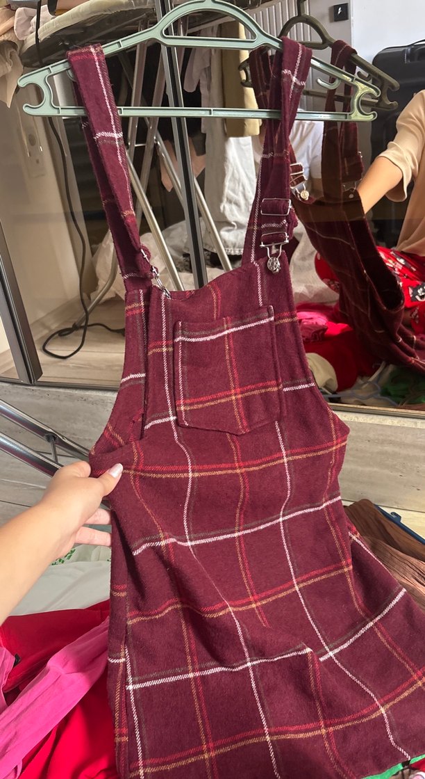Yumuşak tekstil kumaştan yapılmış, ayarlanabilir kemerli askılı bordo kareli kız salopet, bol kesim ve sokak modasına uygun.