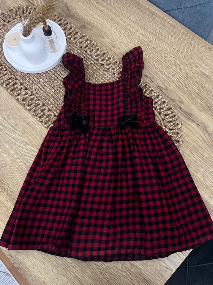 Bordo kareli, kolsuz ve fırfırlı askılı straplez yaka kız elbisesi, bol kesim ve gotik tarzda, tekstil kumaştan yapılmıştır.