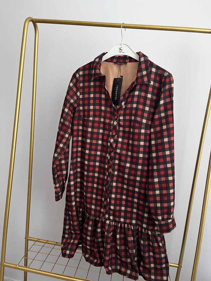 Bordo kareli mini elbise, uzun kollu, notlu yaka ve düğmeli. Salaş kesim, sentetik kumaştan, günlük sokak stili için uygundur.