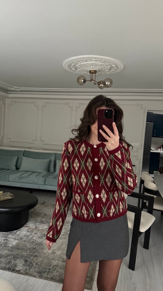 Bordo renkli, kareli desenli ve uzun kollu örgü kadın hırka. Dar kesimi ve yuvarlak yakasıyla günlük kullanıma uygundur. 1 kez giyildi