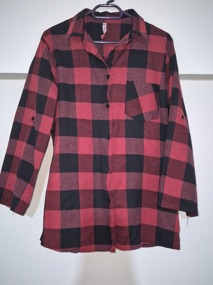 Bordo kareli, pamuklu kumaştan yapılmış, düğmeli ve uzun kollu kadın gömleği. Notlu yaka ve rahat kesimle günlük kullanıma uygun. - Kalın oduncu gömlek. Bordo renk. Butikten alındı. M beden. Temiz durumda. Kolu düğme ile birlikte kısa da kullanılabiliyor.