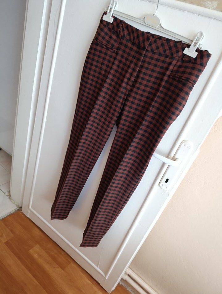 Bordo kareli, tokalı detaylı kumaş pantolon. Normal boy midi kesim, iş ve günlük sokak stiline uygun. ölçüsü 43 e 98 cm