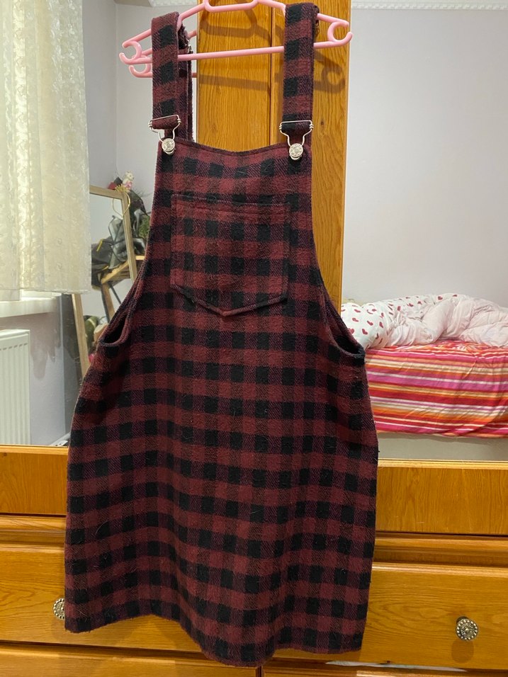 Ayarlanabilir askılı, ön cepli bordo kareli koyu renk tulum