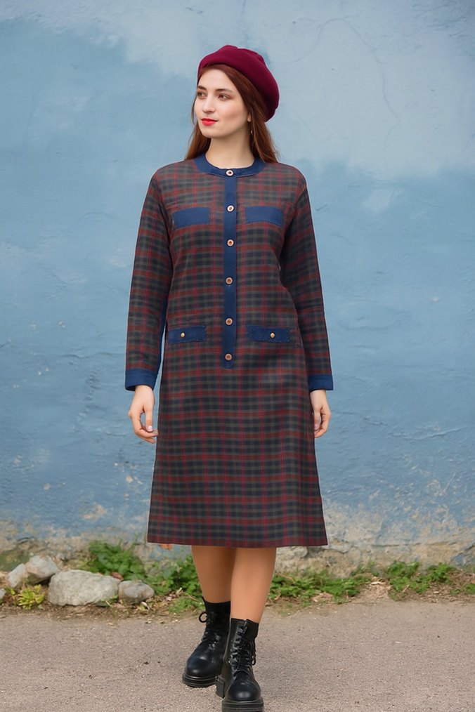 Bordo renkli, kareli desenli, uzun kollu ve düğmeli, regular fit uzun elbise. Sentetik kumaştan, günlük kullanıma uygun.