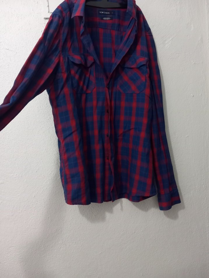 Bordo kareli, uzun kollu, düğmeli, yakalı ve bol kesim erkek gömleği. Midi boyda, sentetik kumaştan, günlük rahat stil için uygundur.