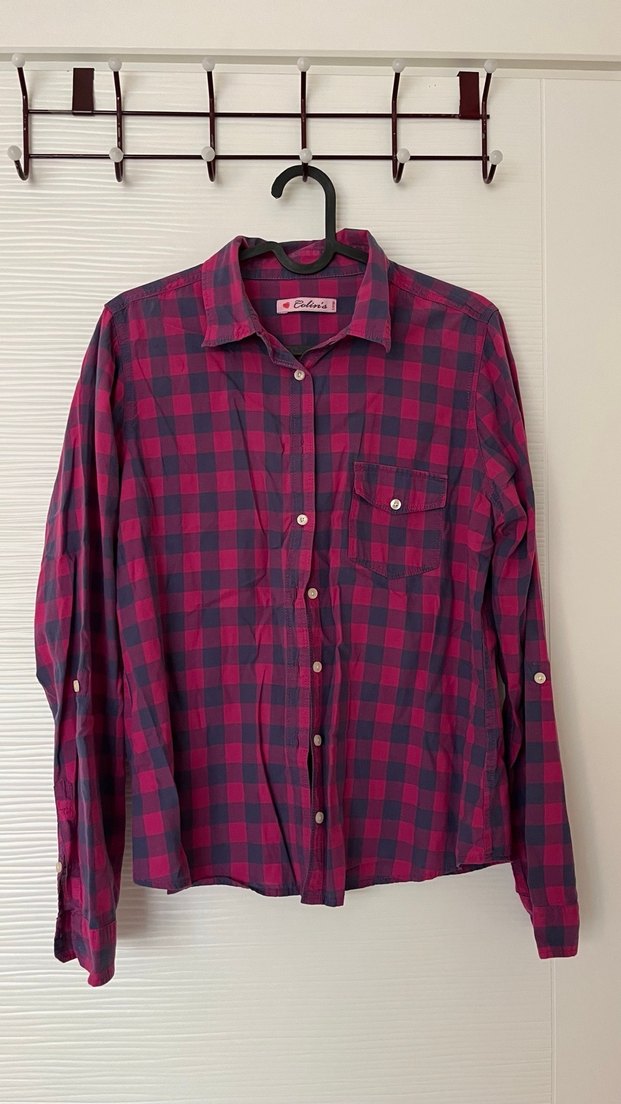 Bordo kareli desenli, düğmeli uzun kollu pamuklu gömlek, regular fit ve yakalı tasarımla günlük kullanıma uygun.