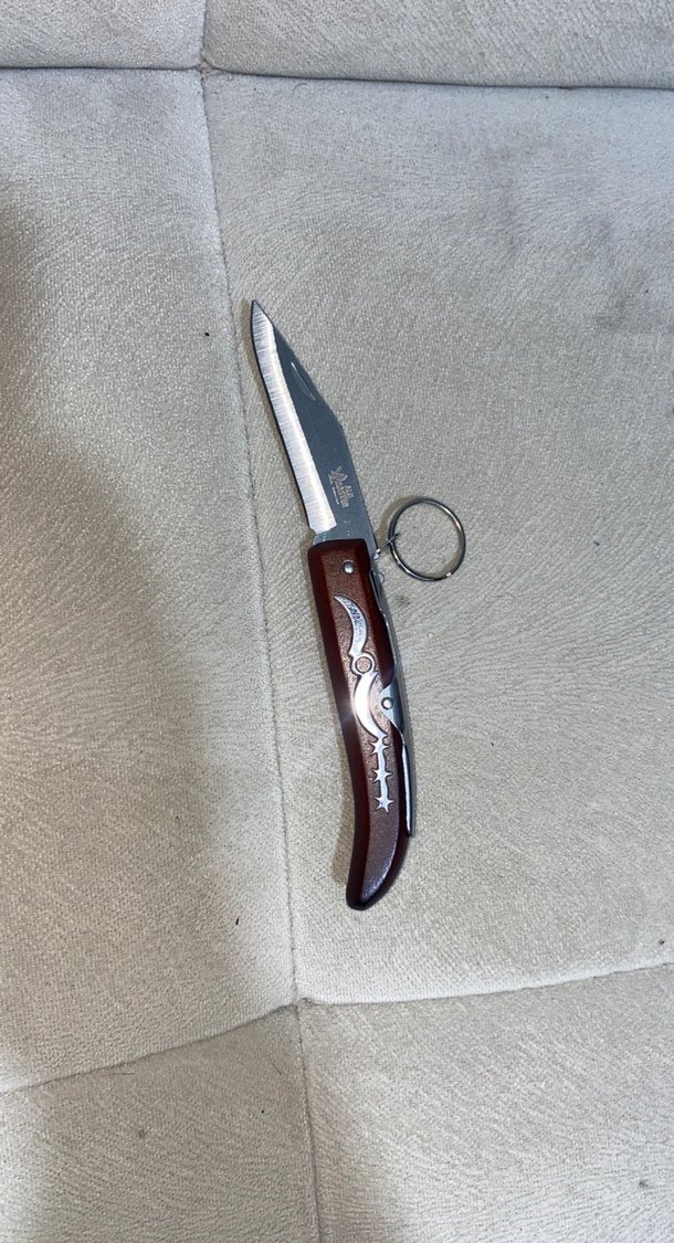 Bordo renkli katlanabilir çakı, keskin bıçağı ve anahtarlık halkası ile kullanışlı ve kompakt bir tasarıma sahiptir.