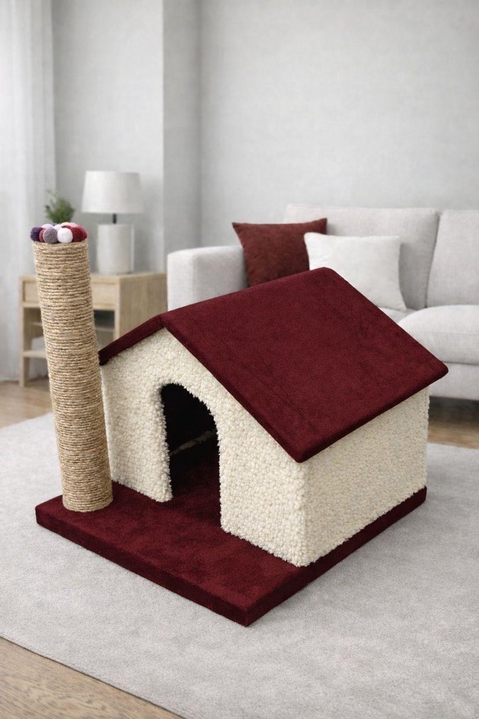 Yumuşak dokulu bordo kedi evi ve üzerinde renkli toplar bulunan tırmalama direği