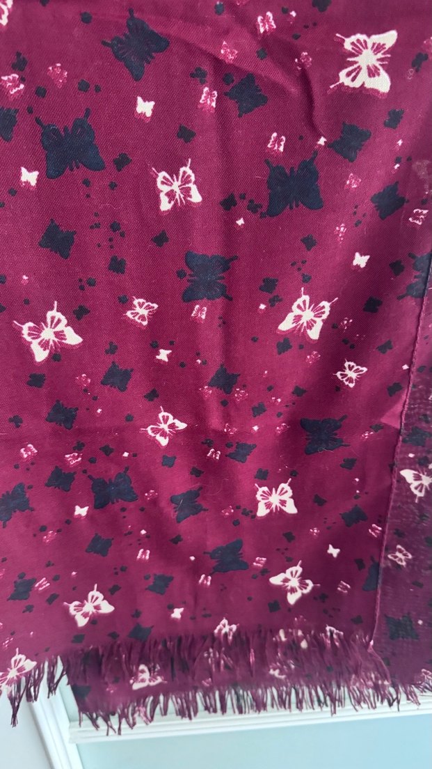 Bordo renkli, kelebek desenli ve detaylara sahip kadın şalı, yumuşak ve rahat dokusuyla bohem tarzı sevenler için ideal.