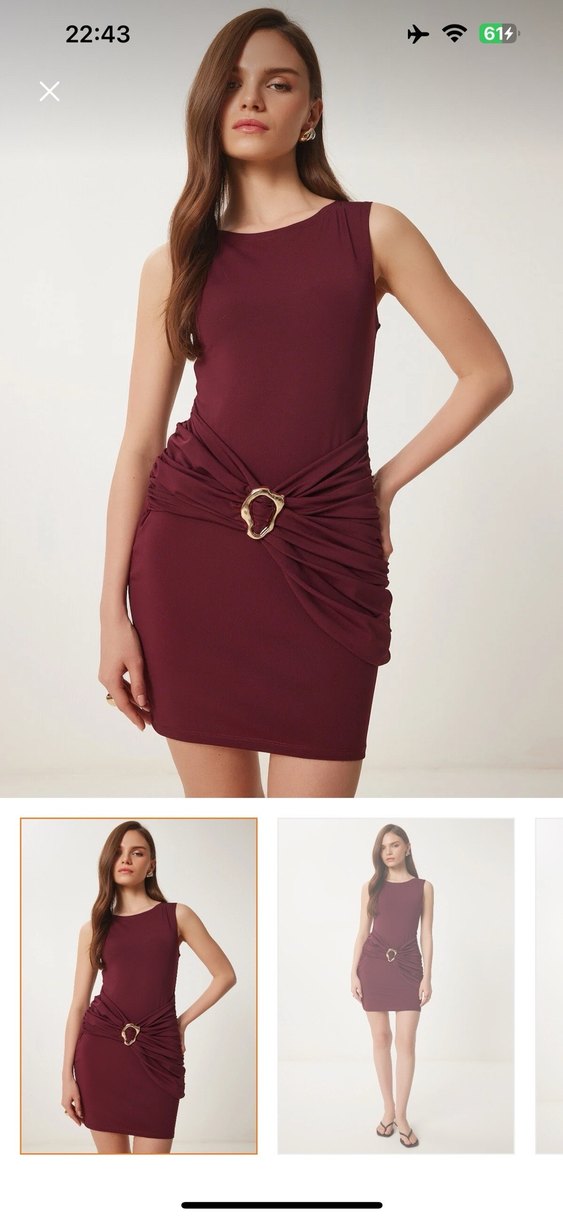 Bordo renkli, kolsuz ve bisiklet yaka mini elbise. Bel kısmında kemer detayı bulunur. Düz ve şık tasarımıyla modern bir görünüm sunar.