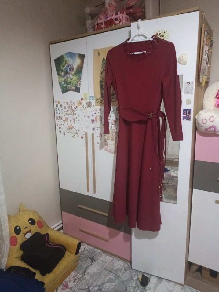 Bordo renkli, yüksek yakalı, uzun kollu ve kemerli triko elbise. Bol kesimi ve bohem tarzıyla günlük kullanıma uygundur.