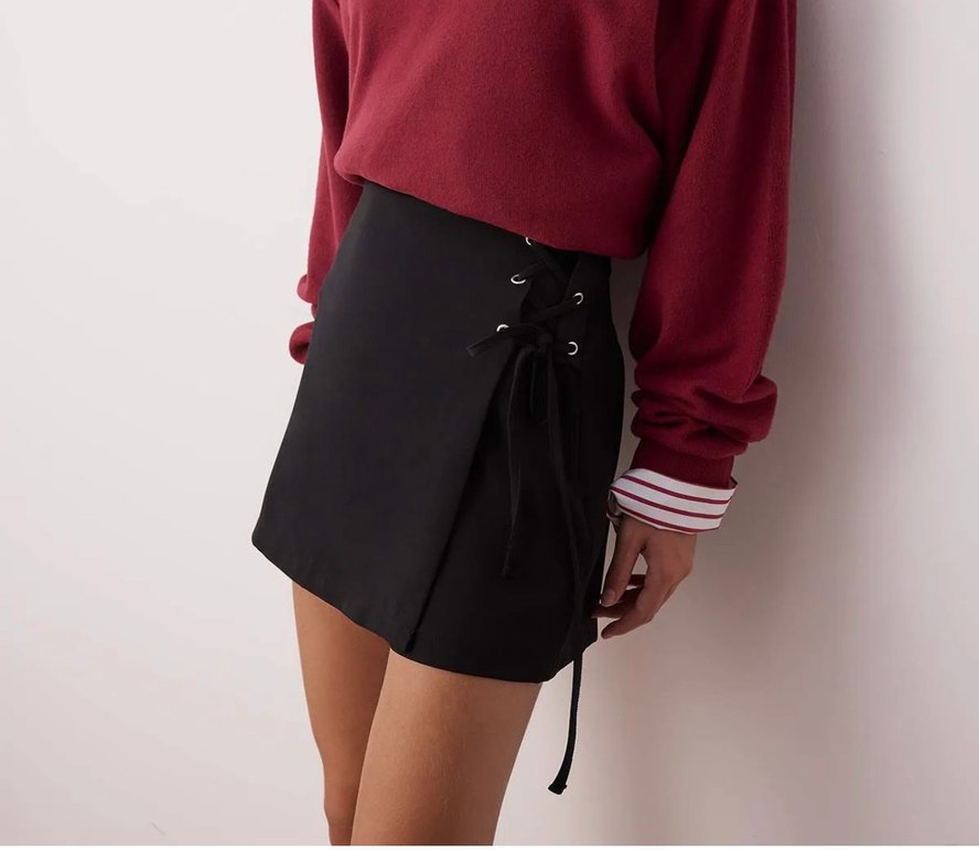 Bordo renkli, gevşek kesimli ve kemerli mini etek. Yumuşak sentetik kumaştan üretilmiş, romantik akşamlar için karanlık gotik stile uygun.